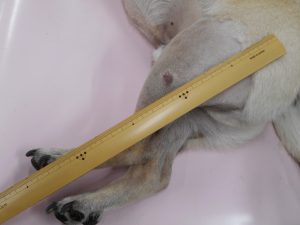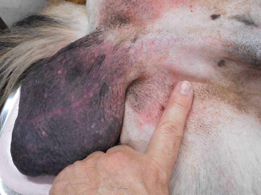 陰嚢の腫瘤は肥満細胞腫と診断されます。陰嚢であることから皮膚の肥満細胞腫のグレードは正確には適応されませんが、陰嚢に形成される腫瘍では、通常の皮膚の腫瘍よりも悪性の挙動を示すことが経験されます。マージン部に腫瘍性の病変は認められませんが、腫瘤内には広範囲の壊死が起こっており、境界は不明瞭となっています。大型の腫瘤が形成されていることから、引き続き、鼠径リンパ節への転移について経過には注意が必要です。両側精巣はびまん性に萎縮していますが、片側の精巣には精上皮腫とライディッヒ細胞腫が認められます。腫瘍はいずれも精巣実質に限局しており、摘出状態は良好です。今回の切除により予後は良好と考えられます。