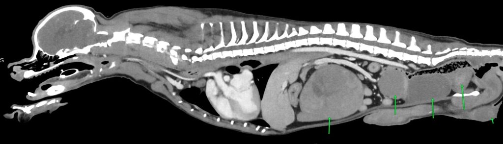 矢印左から脾臓腫瘤不明な腫瘤、膀胱、前立腺睾丸