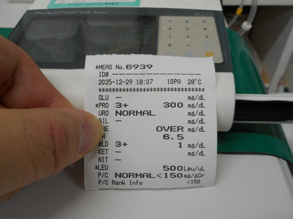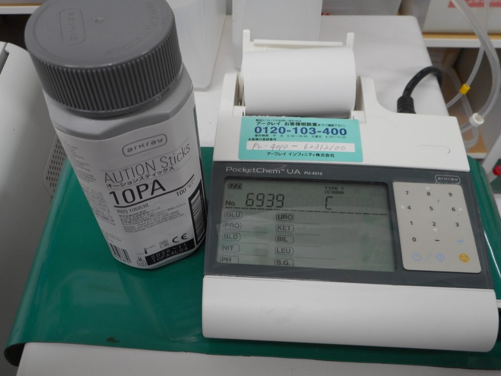 尿糖や尿蛋白、尿ケトン、潜血、ph、尿比重を測定します