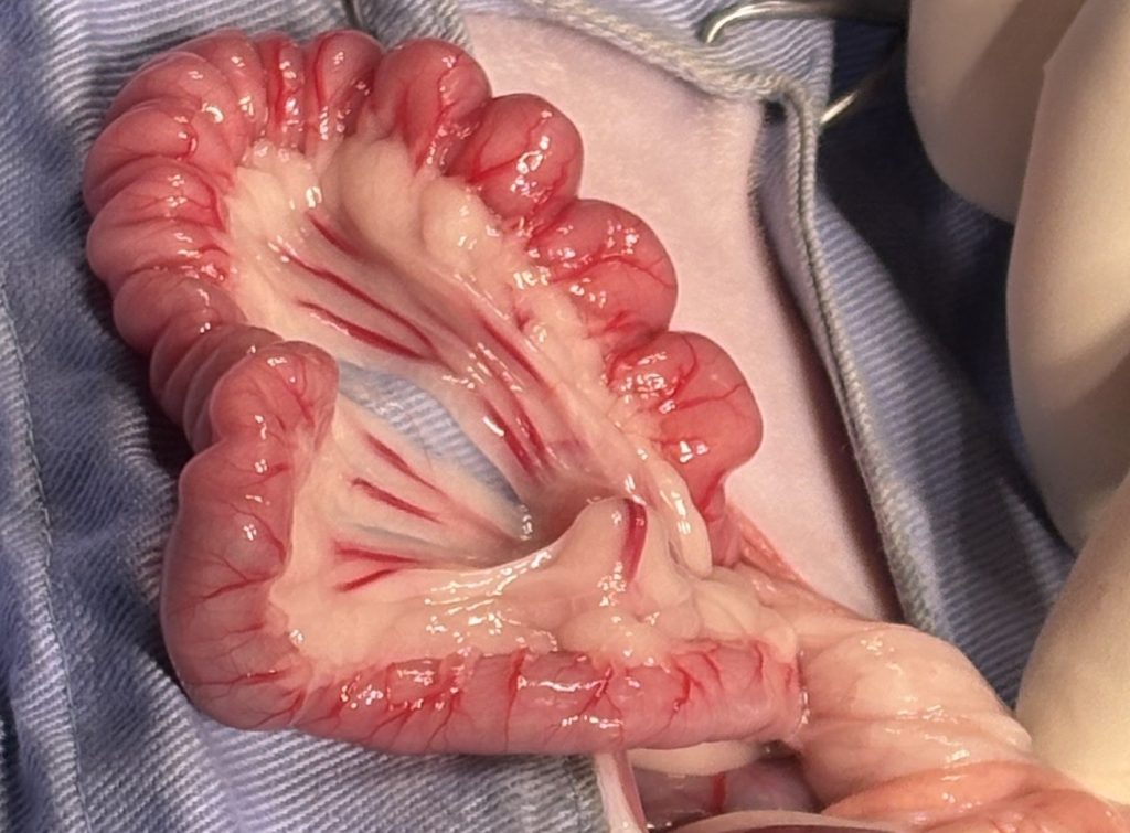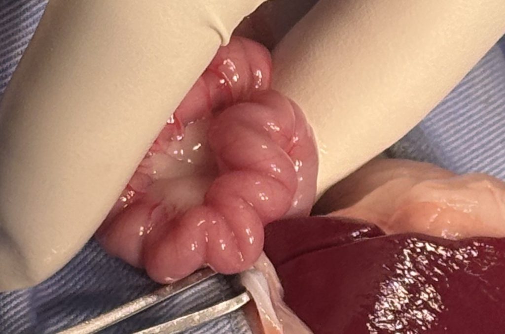 小腸の回腸を切開して糸を取り出し、その糸を切る